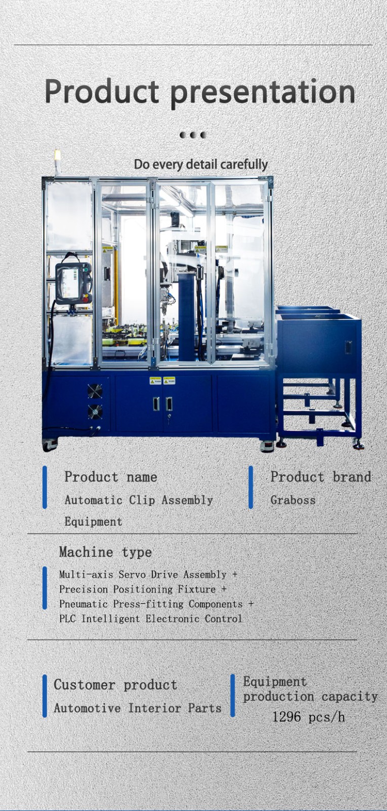 This equipment is specially designed for clips on automotive interior components. It integrates multi-axis servo drive and precision positioning technology, enabling fully automatic feeding, assembly and press-fitting, and efficiently completing the precise installation and integrated operation of clips.